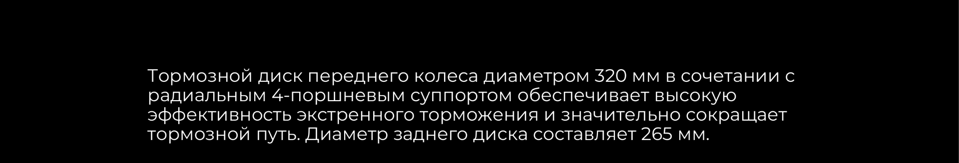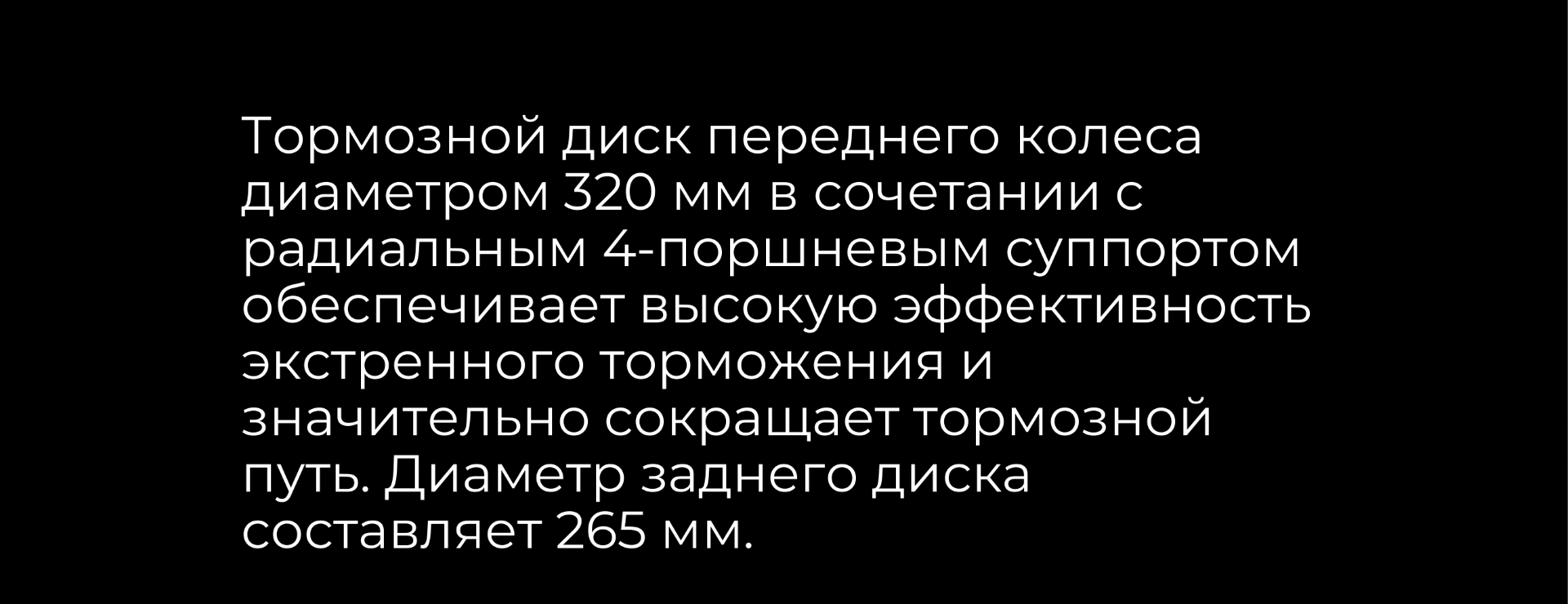 Тормозная система произведена испанской компанией J.JUAN, входящей в холдинг BREMBO. Это дисковая гидравлическая система с 4-поршневым суппортом спереди и однопоршневым сзади.