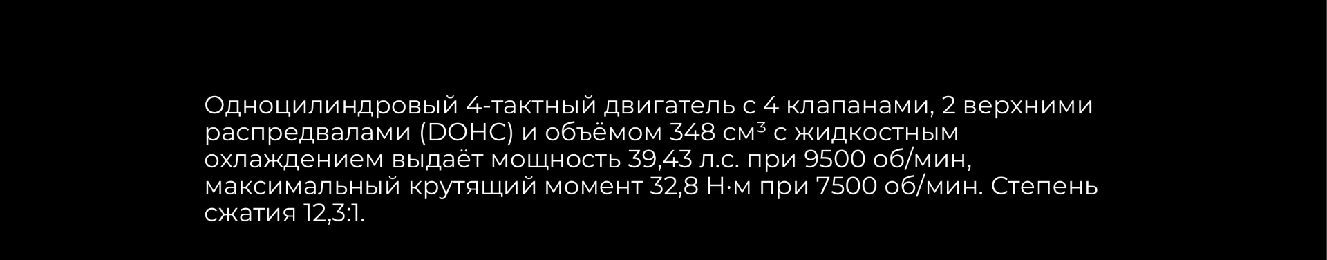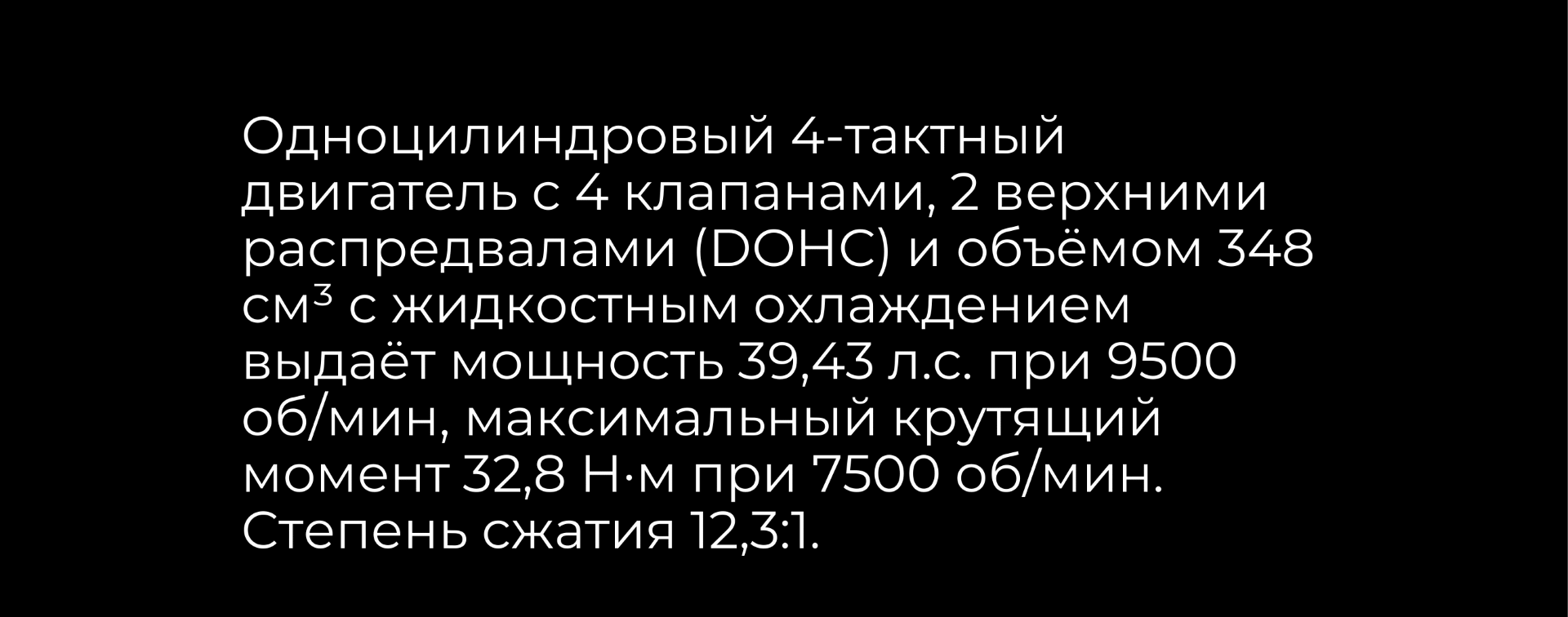 Силовая установка представлена одноцилиндровым 4-тактным двигателем с 4 клапанами и 2 верхними распредвалами. Объём двигателя 348 см³, мощность 39 л.с. Оснащён инжектором BOSCH и системой жидкостного охлаждения. 6-ступенчатая трансмиссия. Запуск двигателя осуществляется с помощью бесключевого доступа.