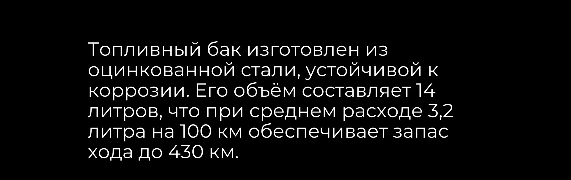 Конструкция. Габариты мотоцикла 2080х860х1325 мм, колёсная база 1430 мм, высота по седлу 765 мм, вес 186 кг. Топливный бак имеет объём 15 литров.